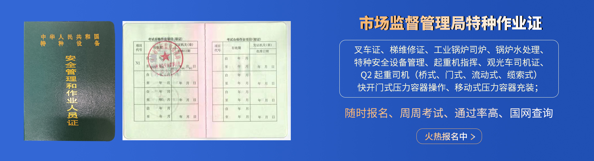 叉車證,電梯維修證,起重司機-橋式-門式-流動式,起重指揮,壓力容器操作,鍋爐司爐,水處理,特種設(shè)備管理,觀光車;